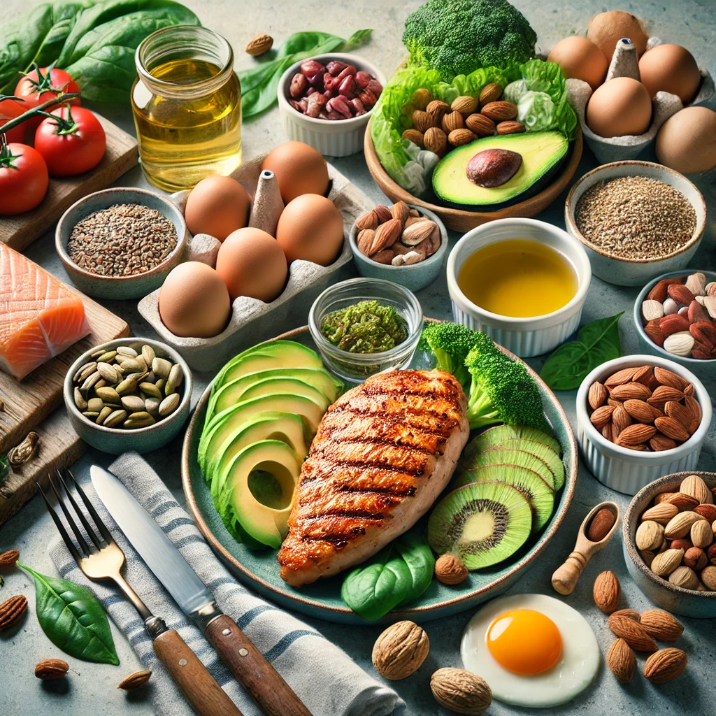 탄수화물 제한: 하루 탄수화물 섭취량을 20-50g으로 제한하며, 주로 녹말이 적은 채소와 견과류, 씨앗류에서 탄수화물을 섭취합니다.