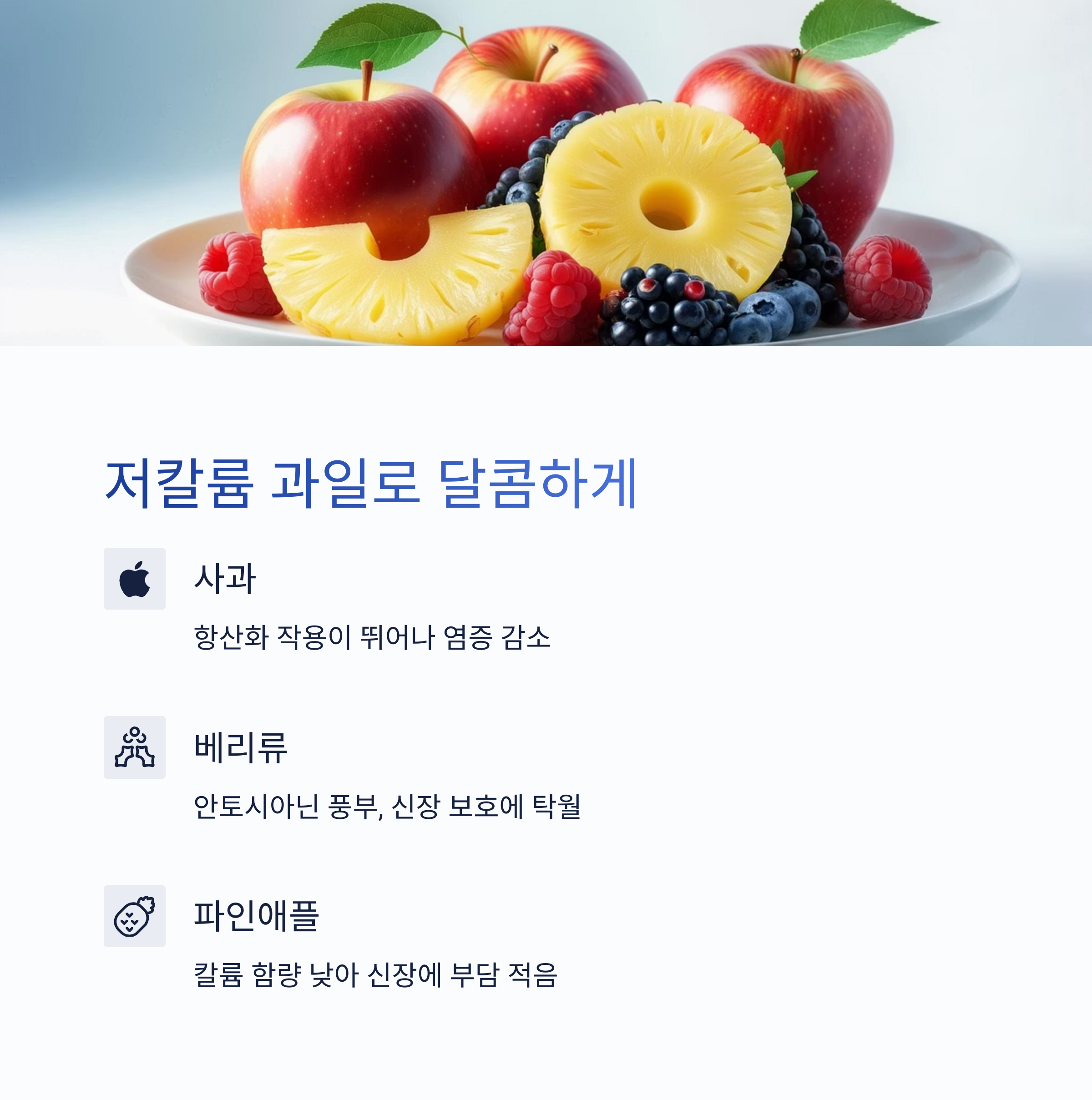 신장 기능이 저하된 사람에게 가장 주의가 필요한 영양소 중 하나가 바로 ‘칼륨’입니다. 칼륨이 지나치게 많으면 체내에서 배출이 어려워지고, 이는 심장에 무리를 줄 수도 있죠. 그래서 칼륨이 낮으면서도 맛있고 영양이 풍부한 과일이 중요해요.