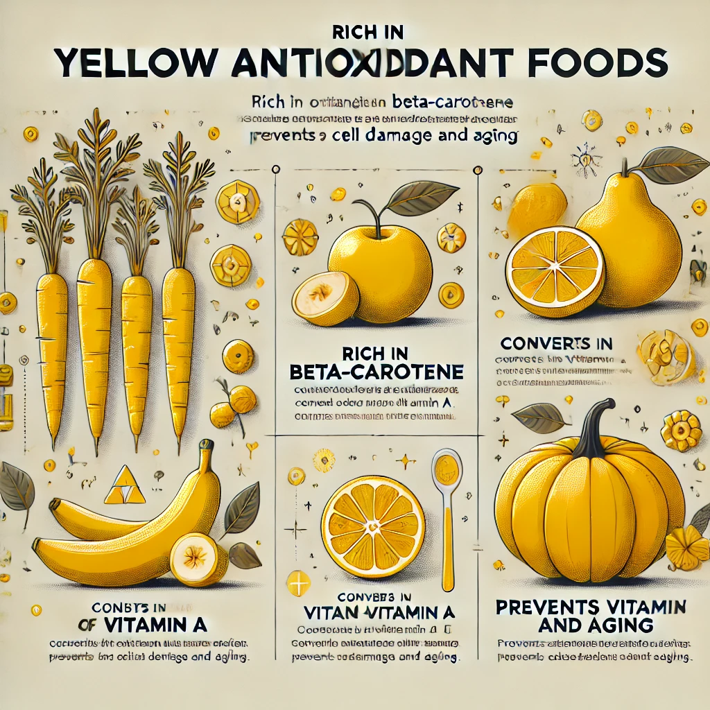 효과: 노란색 식품은 베타카로틴이 풍부하며, 이는 체내에서 비타민 A로 변환되어 세포 손상을 방지하고 노화를 예방합니다. 오렌지와 단호박도 비타민 C와 베타카로틴을 제공하여 항산화 작용을 돕습니다.