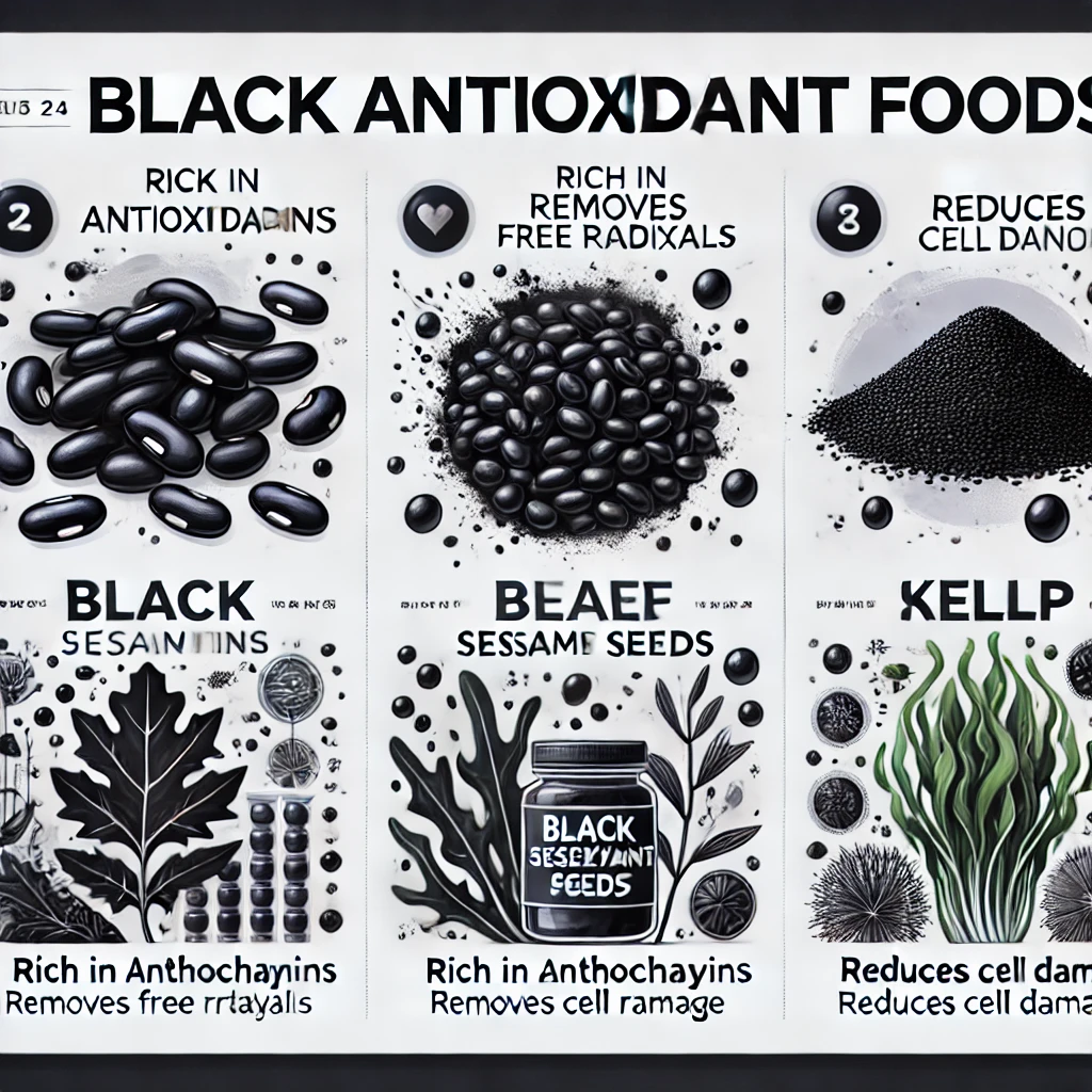 효과: 검정색 식품에는 안토시아닌이 다량 함유되어 있어 활성 산소를 제거하고 세포 손상을 줄이는 데 효과적입니다. 검은콩과 검은깨는 특히 건강에 유익하며, 해조류도 항산화 효과를 제공합니다.
