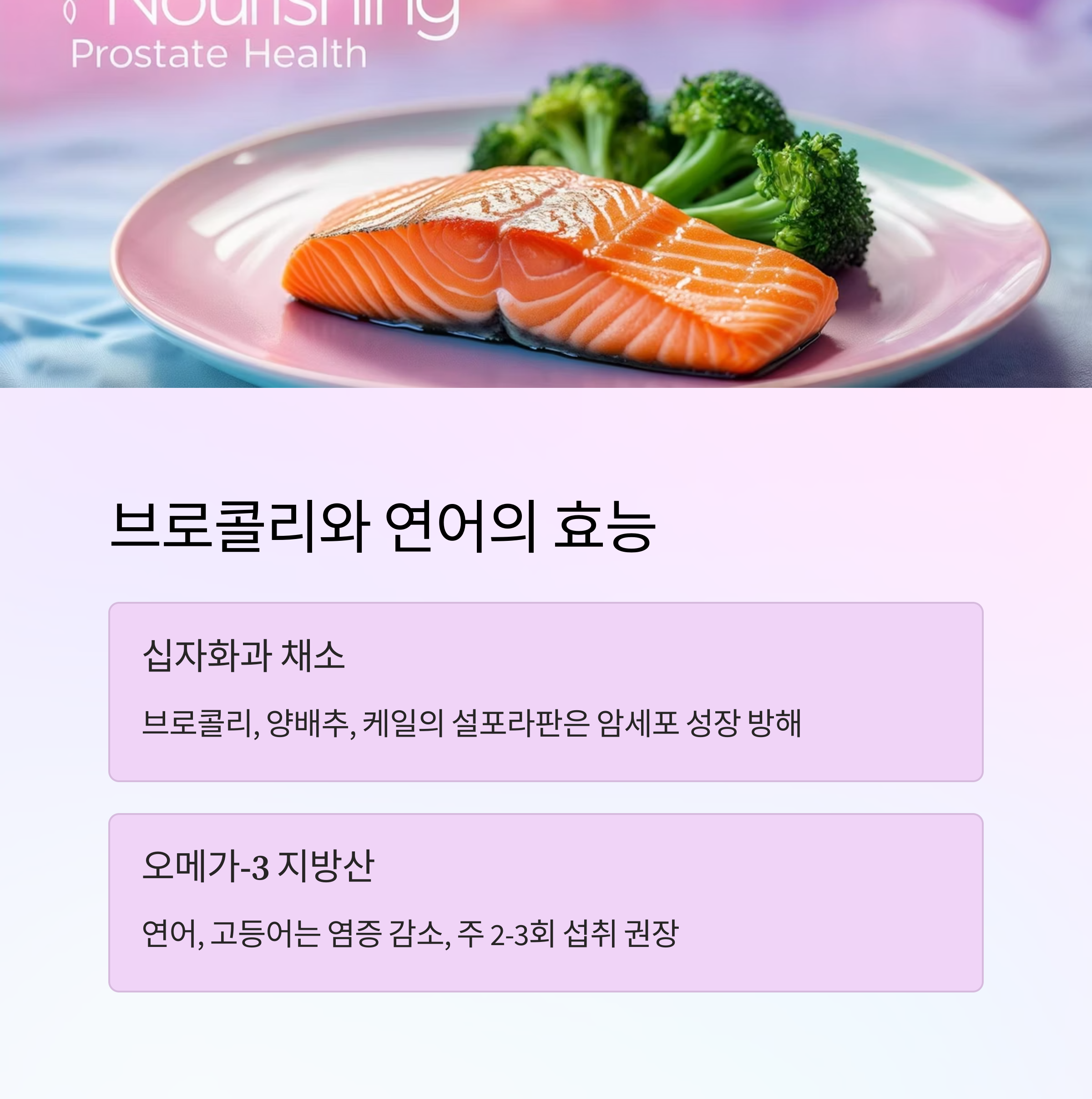 브로콜리를 포함한 십자화과 채소(양배추, 케일, 콜리플라워 등)는 설포라판(Sulforaphane)이라는 항암 물질을 함유하고 있어 전립선암 예방에 효과적입니다. 이 성분은 체내 해독 효소를 활성화하고 암세포의 성장을 방해하는 것으로 알려져 있습니다.